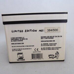New in box, 2006, Critterbox brand, Gary Baseman designed, “Hot Cha Cha Cha” devil / demon designer vinyl figure. This is a limited edition version of this figure, #384 out of 500 created. It has a black flocked (velvet textured) surface. Only taken out of the box to shoot photos. IMPORTANT: There may be signs of edge wear on the box from being in storage. (See photos for details) I am the original owner. It has been in climate controlled storage since acquired. Comes from a pet and smoke free home.