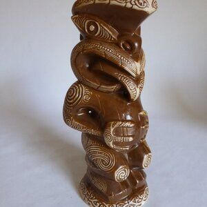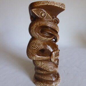 New, 2014, Crazy Al designed, Mahalo Tiki produced, Tiki Farm manufactured, ceramic tiki mug entitled “Teko Teko Manaia”. “This is Mahalo Tiki's first full collaboration with Tiki Farm. This Maori inspired tiki mug is finished in a dark brown semi gloss glaze with some wipe-away to show off Al's attention to detail in his sculpt. Premiered at Tiki Oasis 2014. The brown version is exclusive to Mahalo Tiki.”