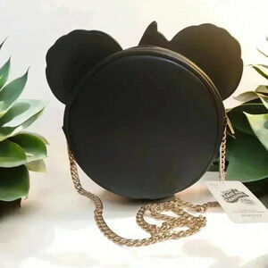 This Skinnydip crossbody bag is perfect for any casual occasion. With a round shape and a zip closure, this bag features a gold chain strap and gold hardware. The orange faux leather exterior is accented with a printed Mickey Mouse design, making it a fun addition to any Disney fan's collection. The bag measures 8 inches in height and has a 2-inch bag depth, providing ample space for all your essentials. The crossbody strap allows for comfortable and convenient wear. This bag is a must-have for anyone who loves Mickey Mouse and Halloween.