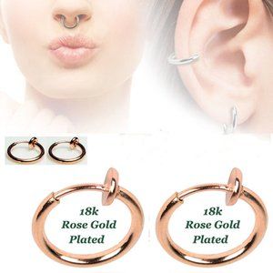 NEW 2-18k Rose Gold Plate Spring-Fake Cheater Nose-Lip-Ear Rings. Hoops No Pain! UNISEX, You receive two (2) NEW! WITHOUT TAGS, NEW! 18k ROSE GOLD PLATED, Fake nose rings/ Hoops. These have a spring activated lever that when placed there is No Pain, easy placement and NO Piercing! All Ages, All occasions, Make a statement, (Or Not). Rings Measure 13mm / 14g - NOTE:NO RETURNS ON THIS ITEM FOR OBVIOUS HEALTH REASONS. All rings are tested B4 shipping. Please understand that colors may slightly differ due to cameras and Lighting. Thank you for looking, Have A Groovy Day & Enjoy! Z-Z1