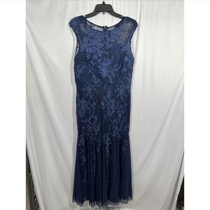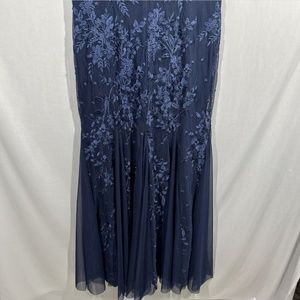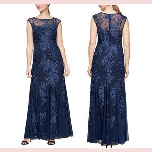 NEW $219 Alex Evenings [ 14 ] Illusion Neck Lace Embroider Godet Gown Navy S628
