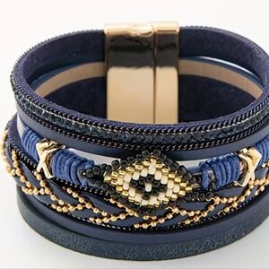NEW 2/$40 Boho Blue and Gold Wide Beaded Magnetic Bracelet-(#0227)