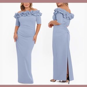 NEW $248 XSCAPE [ 18W ] Ruffled Off the Shoulder Sheath Gown in Sky Blue