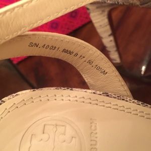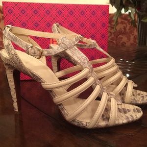 Snake-print Tory Burch sandals detailed with rolled leather straps and a buckle ankle closure. Covered heel and leather sole