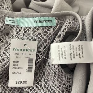 Maurices NEW $29 Boho Grey Embroidered Trim Shark Bite Long Line Tank Top sz S. Features a soft grey flowy 100% rayon crepe fabric, embroidered geometric floral ribbon trim, fishnet embroidered top and shoulders in a racerback style, shark bite hemline, long line fit. Brand new with tags (Retail $29) and no flaws to note. This would be so cute with cut off shorts or as a swim coverup - perfect for your next cruise or beach vacation!