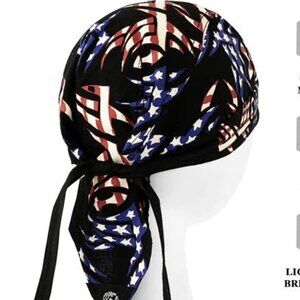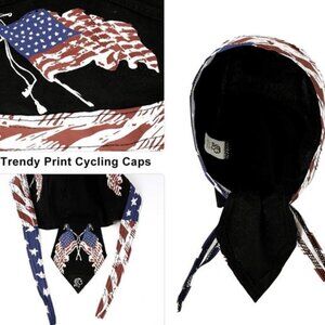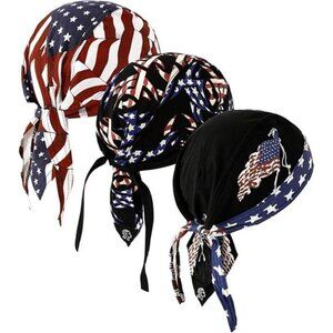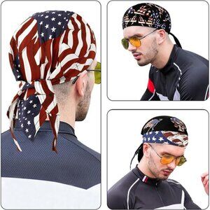 Classic stripe & star print 3 pcs unisex helmet liner dew rag in 1 pack with two belts in the back is designed with black blue red American patriotic pattern to show off personalized, relaxing, and stylish daily headwear style; Match with your various sports and apparel or cosplay costumes