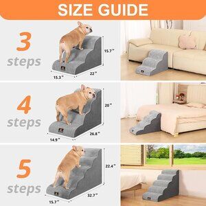 Condition: BRAND NEW HIGH DENSITY FOAM - Our dog steps are made of high-density foam, providing a comfortable and supportive surface for your furry friend to climb on. High-density foam is known for its excellent support capabilities. It offers firmness and stability, ensuring that your dog's weight is evenly distributed across the stairs. This helps to prevent any sagging or sinking, maintaining a reliable and sturdy surface for your pets. 3 STEP OPTIONS - The dog stairs offer three different options for the number of steps: 3 steps, 4 steps, and 5 steps. Each exhibits the same sturdy construction, non-slip surface, and dog-friendly stable design. The choice of the number of steps depends on the specific needs of your dog and the height of the furniture they require access to.