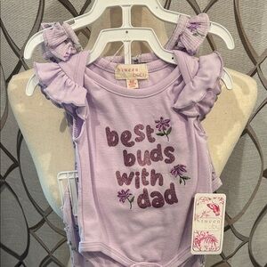Charming lavender bodysuit with playful text and floral accents. Includes matching leggings. Size 6 months