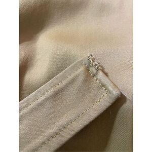 White sleeveless bodice with raw frayed edges. Hook & eye side closures on top. Skirt is an olive khaki with large slits all the way around. Midi length. Attached belt. Hidden side zip. I repaired a loose seam right below the zipper, as shown. There is also a flaw in the edge of the belt, as shown. Small hole under arm which I have not tried to repair.
