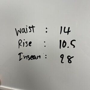 No visible flaws noted. Waist = 14 inches, Rise = 10.5 inches, Inseam = 28 inches.