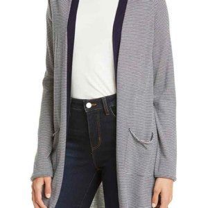 Open-front styling and a longer length make layering easy with a striped cardigan knit from a fine blend of silk, wool and cashmere.