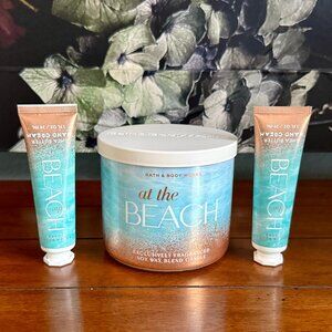 Brand NEW 3-Pc Bath & Body Works AT THE BEACH 3-Wick 14.5 oz Candle & 2 Hand Creams