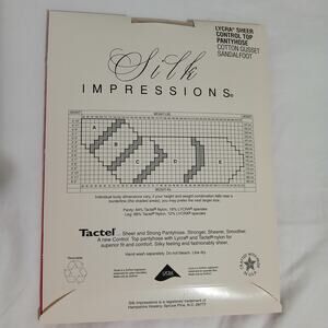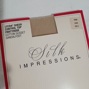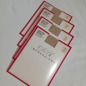 Enhance your wardrobe with this set of 4 brand new pairs of Silk Impressions pantyhose. These Sand color, size C, sheer control top pantyhose are made with Lycra for a smooth, comfortable fit.