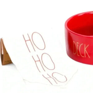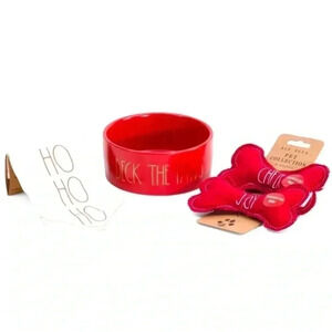 NEW Rae Dunn (4) FOUR PIECE SET - DECK THE PAWS - (1) RED Glazed Ceramic Pet Bowl/Dish with GOLD Lettering, (1) Cotton Bandana, & (2) Fabric Squeaky Bone Toys - Bowl is 6” (Medium Sized)