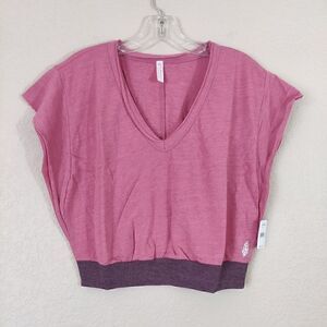 Perfectly in place at barre class or a brunch date, this V-neck cropped tee features flared cap sleeves and a wide ribbed hem with distressed details. Sweatshirt texture. Cotton polyester rayon blend.