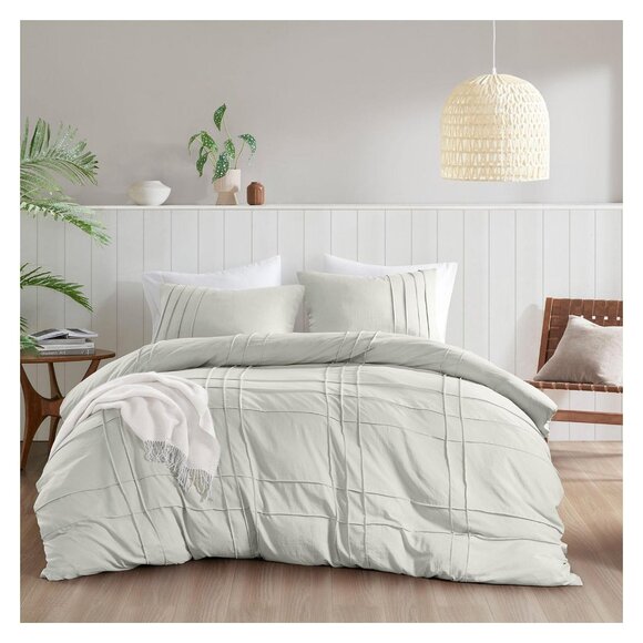 Featuring a chic grid pattern, our pinch pleat duvet cover set offers a sleek design crafted from soft materials. Made to be breathable for all seasons, the pre-washed microfiber cover has been treated to pamper your skin with extra gentleness, inviting you to unwind and rejuvenate. Due to the premium microfiber fabric and our innovative dyeing technique, this duvet cover set is machine washable, durable, and damage resistant. Rounded off with an oeko-tex safety certification and button closure to keep the filling from shifting, for a refreshing rest. The set includes 1 duvet cover and 2 matching shams (1 sham in twin/twinxl) Displaying a chic design that combines refined pinch pleats with a stylish grid pattern. Crafted from a premium polyester microfiber fabric known for its flexibility and durability. The pre-washed microfiber fa sku: 6878ed324703c-16878ed3247040
