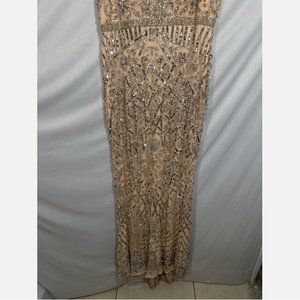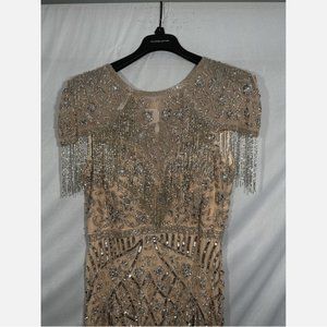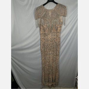 NEW $598 MAC DUGGAL [ 14 ] Embellished Fringe Cap Sleeve Gown Platinum #S807