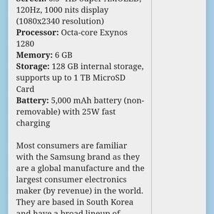 It had 6 GB of ram. 128 GB of rom. 5,000 mAh battery. Normally costs between $250. Over $200 locked. This is locked but is compatible with SafeLink wireless. Straight talk wireless. TracFone wireless. And other TracFone family companies such as Verizon wireless and net10 and Page Plus and simple mobile. Will unlock 60 days after activation. Will pass IMEI blacklist check and Accu battery test to prove it's not still in and not used. Asking $50 less than the average price. Also have a $35 plan with unlimited talk and text plus 10 GB if interested for $35 for each three months of coverage about one third price. If you want that contact me first. Will include a charger cable and block did not come with the block but I will add one. Is not in the original box but has not been used but activated and tested to begin the unlocking process sooner for the buyer.