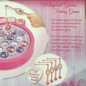 Kids! Catch as many gems as you can! Board spins. Board rotates as magic gems open and close! The classic game of fishing becomes more magical as you try to catch these enchanted gems! As the board spins use the magical wands to catch as many magical gems as you can. The player with the most gems wins! Contents: motorized game board, 21 gems, and 4 wands. Requires 2 AA batteries (not included).