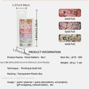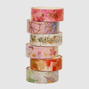 This set of 6 rolls of washi tape features a beautiful gold foiled leaves design, along with geometric and star patterns in shades of pink, green, gold, white, orange, and purple. These tapes are perfect for adding a touch of elegance and charm to your scrapbooking, crafting, or gift wrapping projects. The patterns and colors are sure to complement any theme, and the quality of the tape ensures that it will stick securely without damaging your paper or other materials. Add this set to your collection today and start creating stunning DIY projects!