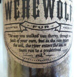 New, never displayed, apothecary bottle label reads: “Werewolf Fur, Imported Premium, “The way you walk was thorny, through no fault of your own, but as the rain enters the soil, the river enters the sea, so tears fun to a predestined end” ( Gypsy quote from the famous movie The Wolfman). Created by “Cradle to Grave Curiosities". This was acquired from an Oddities convention. A talented artisan was selling their spectacular creations in their booth. Perfect for Halloween decor or everyday. It is right out of a Harry Potter film set! This item has never been displayed. (See photos for details) I am the original owner. It has been in climate controlled storage. Comes from a pet and smoke free home.