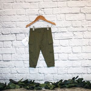Brand new with tags never been used! The perfect winter pants for your growing baby. Color is more of an olive green. Waist has a beige colored drawstring that can tighten the joggers at the waist. there are two side pocks should your baby wish to carry items in their pockets. In true jogger fashion the pants cinch at the ankles. Size is 6-9 months, made of 100% organic cotton.
