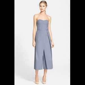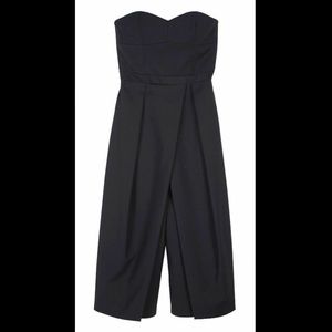 Faux wrap panels fold across the front of a structured strapless jumpsuit for a fresh, architectural look.