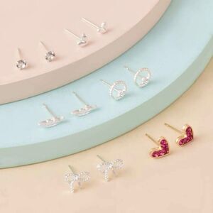 NEW 6 pair of stud earrings, heart, bow, leaf, circle, silver, Sizes between 6-8
