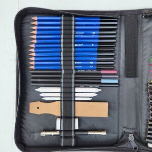 Includes: 12 Graphite Sketching Pencils, 12 Oil Based Colored Pencils, 12 Watercolor Pencils, 12 Metallic Colored Pencils, 12 Black Charcoal Pencils, 4 Pastel Pencils, 1 White Charcoal Pencil, 3 Blending Stumps, 1 Metal Sharpener, 1 Vinyl Eraser, 1 Sandpaper Block, 1 Artist brush, 1 Pencil Extender, 1 Portable Travel Case