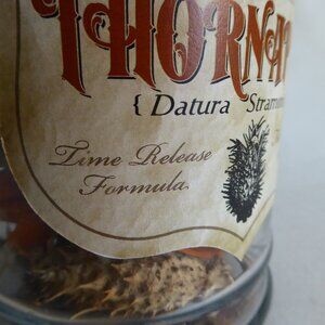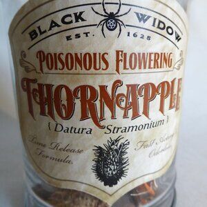 New, never displayed, “Black Widow, Est. 1625, Poisonous Flowering Thornapple, Datura Stramonium. Time Release Formula, Fast Acting Odorless” apothecary glass bottle / jar. The bottle is filled with some type of creepy natural dried plant / pod. Comes with original tag. Created by “Cradle to Grave Curiosities. This was acquired from an Oddities convention. A talented artisan was selling their spectacular creations in their booth. Perfect for Halloween decor or everyday. It is right out of a Harry Potter film set! This item has never been displayed.(See photos for details) I am the original owner. It has been in climate controlled storage. Comes from a pet and smoke free home.