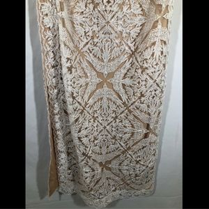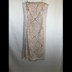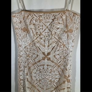 Make a fashion statement with our form-fitting strapless dress. A sophisticated pattern of flowers and birds are masterfully embroidered with radiant metallic beading. The nude lining allows the alluring details to truly shine.
