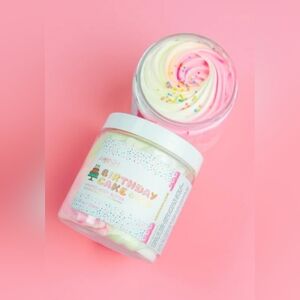 This is a brand new large size container of Aminnah's name brand whipped body butter. It is colored with pink, white and yellow to represent its scent which is birthday cake!
