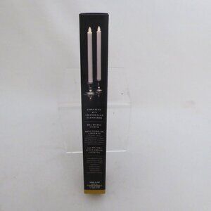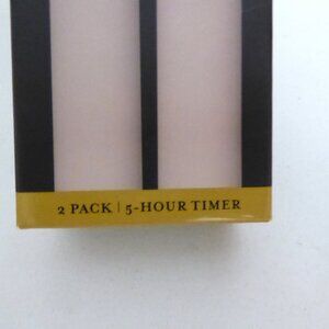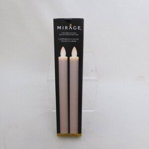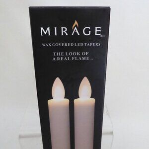 New in box, Mirage brand, real flame effect cream colored, warm White LED, tapered candle set. Unscented, made of real wax. Requires 3 AA batteries not included. They have a built in 5 hour timer. The timer will turn the candle on at the same time everyday and will automatically shut it off 5 hours later. Both candles were tested and they work. Only taken out of the box to shoot photos. (See photos for details) I am the original owner. It has been in climate controlled storage for decades. Comes from a pet and smoke free home.