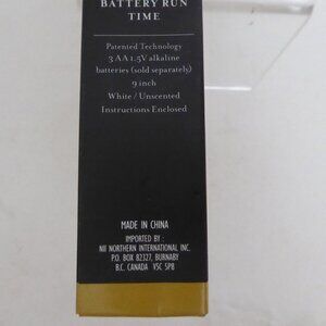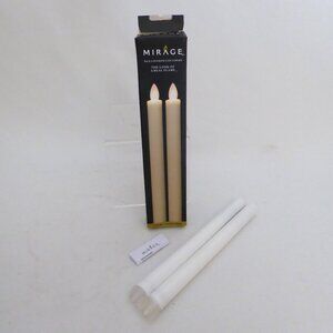New in box, Mirage brand, real flame effect , white colored, warm White LED, tapered candle set. Unscented, made of real wax. Requires 3 AA batteries not included. They have a built in 5 hour timer. The timer will turn the candle on at the same time everyday and will automatically shut it off 5 hours later. Both candles were tested and they work. Only taken out of the box to shoot photos. (See photos for details) I am the original owner. It has been in climate controlled storage for decades. Comes from a pet and smoke free home.