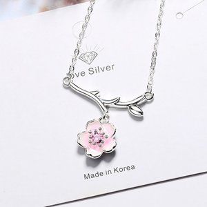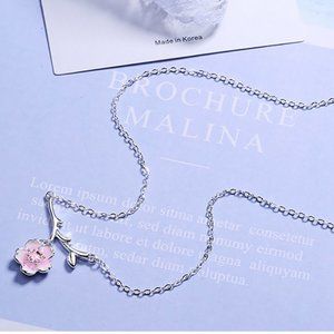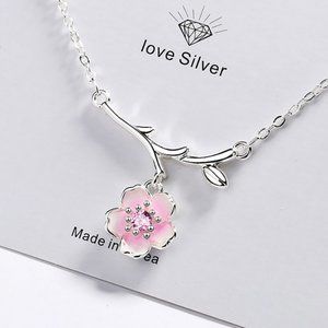 #NEW 925 Sterling Silver Pink White Diamond Cherry Blossom Leaf Branch Necklace