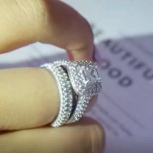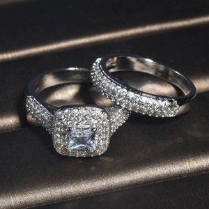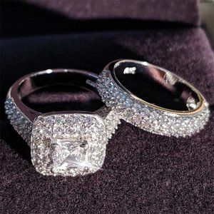 NEW 925 Sterling Silver Princess Halo Ring Set