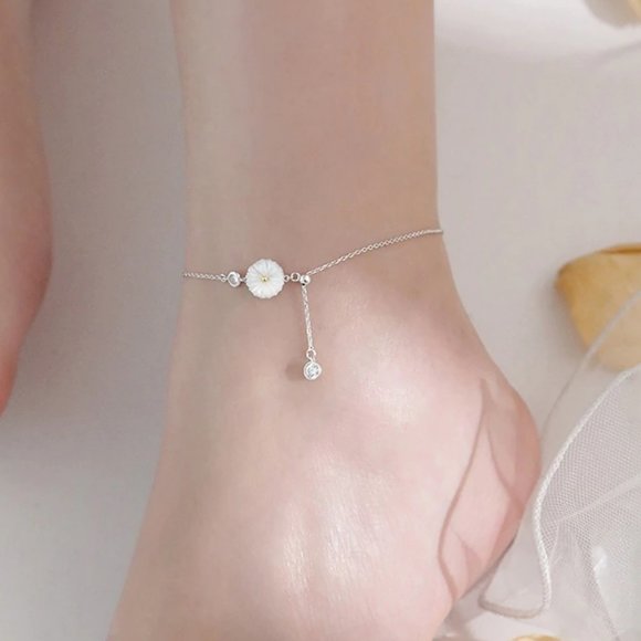 NEW 925 Sterling Silver Shell Diamond Daisy Anklet