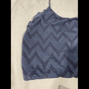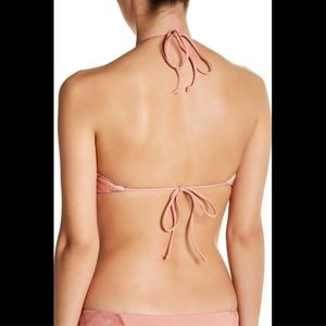 High halter neck - Halter straps - Back self tie closure - Ruffle accents - Solid - Textured chevron print - No padding - Fully lined - Made in USA