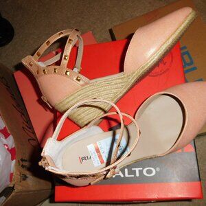 NEW IN BOX, NEVER WORN! 9.5M RIALTO CAMPARI WEDGE CLOSED TOE IN DUSTY ROSE METALLIC. THAS BACK ZIP CLOSURE WITH STRAS AROUND THE ANKLE. ALSO SOME STUDS. CUTE SHOES. 3" WEDGE HEEL WITH JUTE WRAP.