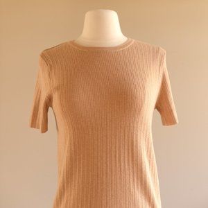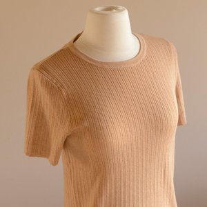 New with tags, never worn. Short sleeved ribbed knit t-shirt by A New Day from Target. Beige tan brown color. Perfect for your neutral wardrobe! Size XS, but it's very stretchy and can also fit a size small in my opinion. It runs a little large in my opinion. Thanks for looking!