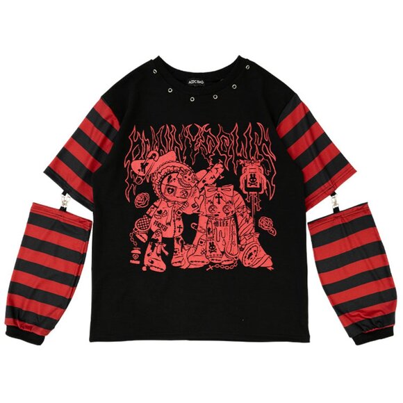 Dark, bold, and bunny-approved! This Bunny Dolls Punky Bunny Black Red Long Sleeves Oversized Tee from ACDC Rag is made for the rebels of the night. This goth-punk rave top features a striking front graphic of the Punky Bunny on a soft polyester base, crew neckline with silver eyelet detailing, optional detachable long/short sleeves for versatile styling, and an oversized unisex fit. Straight from the shadowy streets of Harajuku, this tee is the perfect mix of chaos and cute. If you dare, grab it before it’s gone. #HarajukuGoth