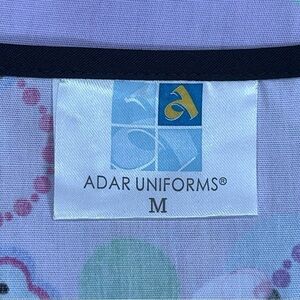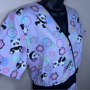 NEW ADAR MEDOUM SCRUBS TOP BELTED SHORT SLEEVE FLORAL PANDS PURPLE COLORFUL
