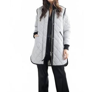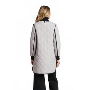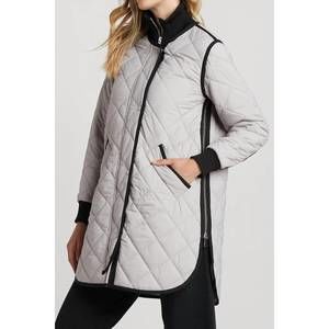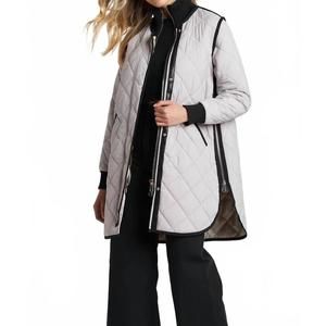 Meet the Libby Quilted Full Zip Coat by Adroit Atelier, a chic outerwear option in an elegant cloud shade, perfect for a holiday party. Crafted with long sleeves, this coat is made from a nylon blend comprising 83% nylon and 17% spandex, with a 100% polyester lining and fill. The mid-length piece features a high funnel neck in rib, welt side pockets, and a 2-way zip front closure with a snap placket, offering a stylish A-line silhouette with diamond quilting that is water repellent. Care for this luxurious coat with professional wet cleaning, mild process, to maintain its sophistication and comfort. Model is 5'9 1/2" and wears a size XS; back length is 35" and the fit is true to size yet loose fitting.