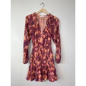 NEW A.L.C. Callie Silk Split Neck Smocked Long Sleeve Mini Dress Coral Pink