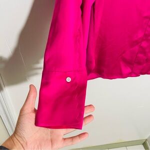 Description: This button-down silhouette features a point collar and scalloped detailing along the sleeves and hidden button placket. Lightweight, non-stretch satin. Scalloped edges. Collared neck. Long sleeves with button cuffs. Button placket.