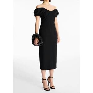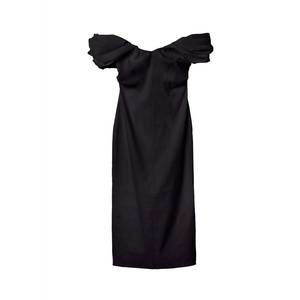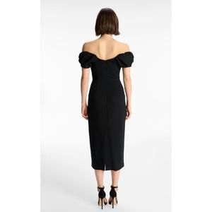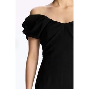 Crafted in the line's structured cady fabric in timeless black. This midi silhouette features an off-shoulder neckline with romantic draped pleating. A svelte, curved-hemmed bodice completes the look with bone corsetry along the interior for structure and support. Slimmer fit. Invisible Zipper. 70% Triacetate 30% Polyester. Lining: 96% Polyester 4% Elastane. Dry Clean. Lined. Model is 5'10" Wearing Size 4. Length 38 1/4"