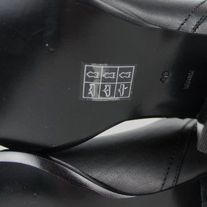 Heeled oxford in smooth black leather with side elastic gores and top stitch detail. Signature cut out heel with rose gold metal plate. Wrapped leather stacked heel and outsole.