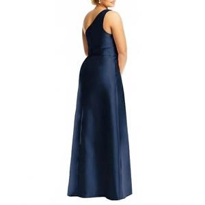 Elevate your formal wardrobe with the Alfred Sung Draped One Shoulder Satin Maxi Dress in Midnight Navy. This sleeveless gown boasts an elegant off-the-shoulder neckline with a full-length, A-line silhouette, perfect for weddings and other black-tie events. Crafted from 100% polyester, this solid, quiet luxury dress features a convenient zip closure. Care is easy with machine wash and tumble dry instructions.