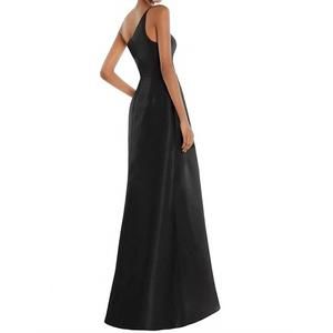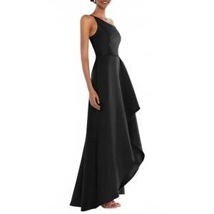Introducing the One Shoulder Satin Gown by ALFRED SUNG, a stunning choice for evening events in elegant black. This gown boasts a sleeveless design with a one-shoulder neckline that beautifully complements its A-line silhouette. Crafted from 100% polyester, it features a dramatic draped high-low skirt, adding a touch of quiet luxury to your fall wardrobe. Closure: Zip closure. Care: Dry clean or machine wash, tumble dry. Made for women seeking a sophisticated evening look.