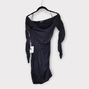Off shoulder mini dress in black with ruched detail. Stretchy, bodycon fit. New with tags. Small wear on sleeve (see last photo).